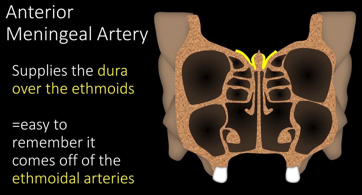 15/You can remember its origin bc the anterior meningeal artery supplies the dura overlying the ethmoids, so it would make sense it arises from the ethmoidal arteries