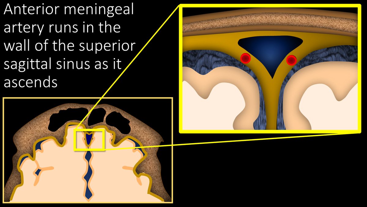 16/Uniquely, as it ascends, the anterior meningeal artery actually runs in the wall of the anterior superior sagittal sinus. It is the only named artery to run in the wall of the sinus.