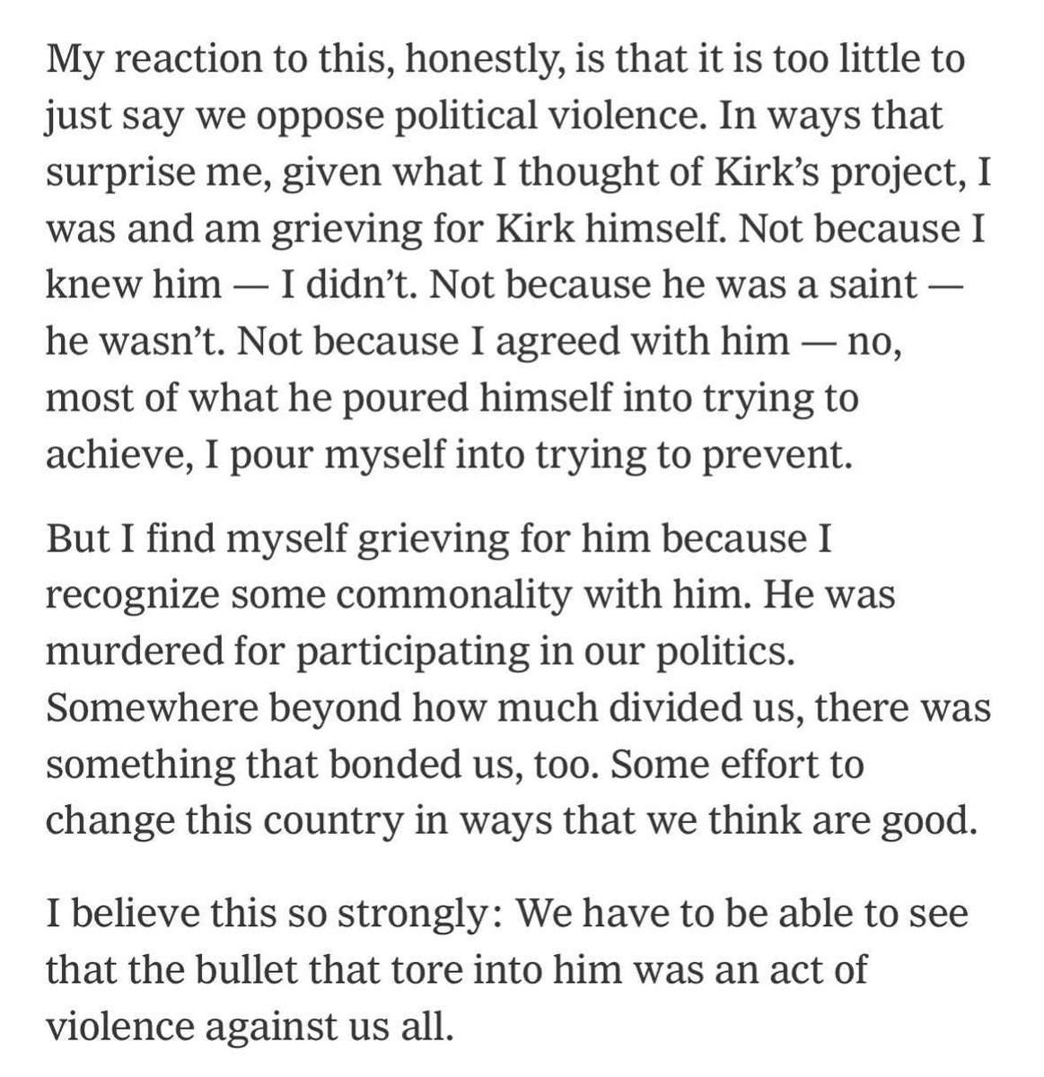 Third, there was the murder of a person for imperfectly but undeniably pursuing democracy, navigating our deepest differences through reasoned dialogue & debate rather than coercion & violence, & for seeing colleges as essential to this task. This is what Ezra Klein was naming.