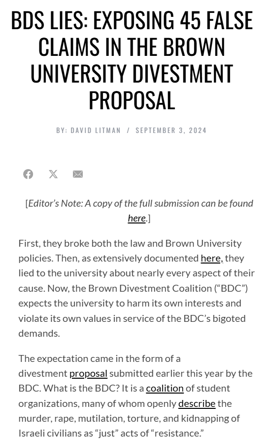 @dmlitman @brown 6/ By Sept 2024, student activists were specifically demanding that @BrownUniversity divest from Israel. CAMERA analysis of their proposal found 45 false claims from “Israel launched the war” to made-up charges of genocide. camera.org/article/bds-li…