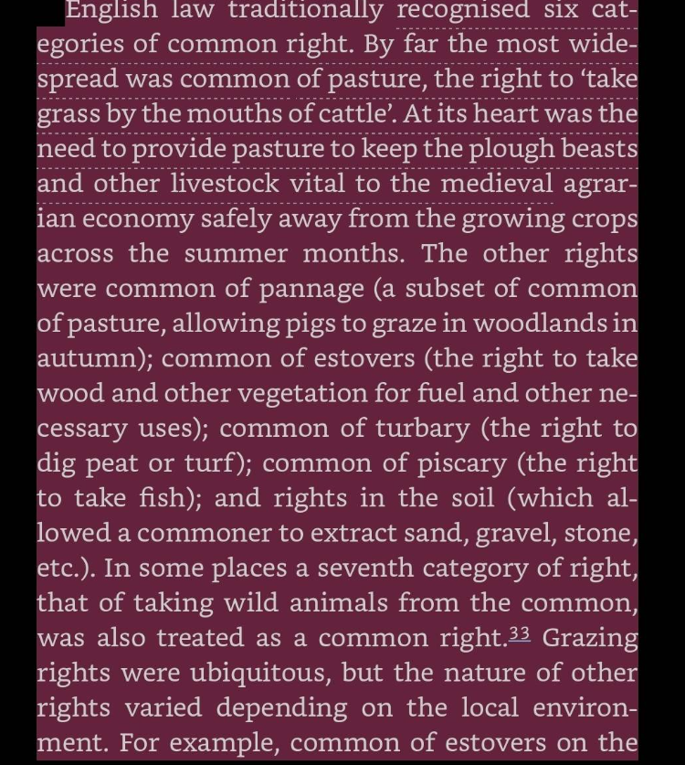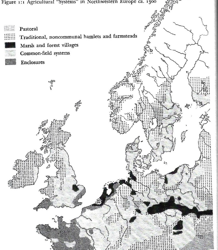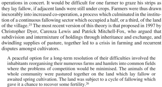 But English manors, while communal, do not have shared land. Rather, the land is held individually but plowed communally. The genuine shared land is the “waste” land, which refers to lands that are not farmland, such as woodland, pasture, or marsh.