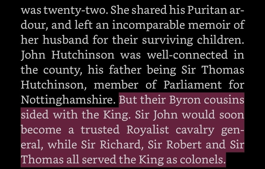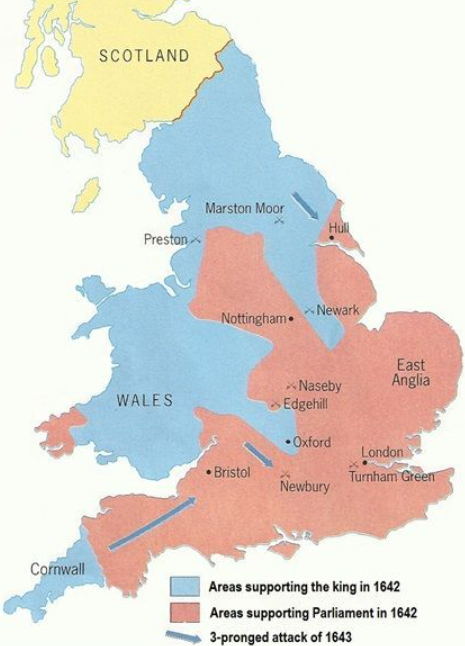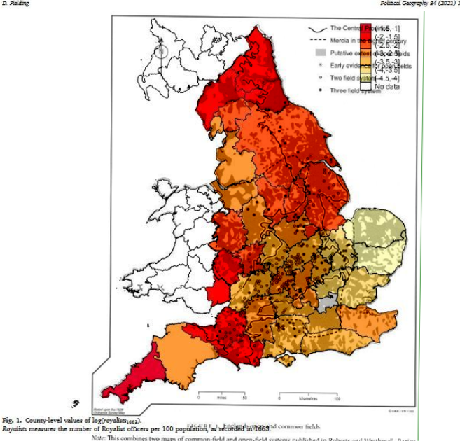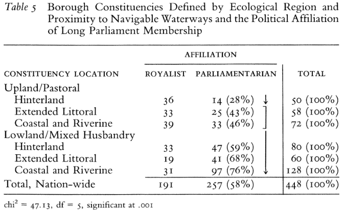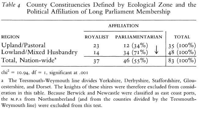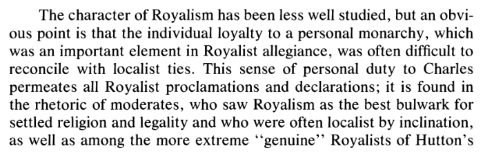 On the material level, the manorial core zone of England was divided between King and Parliament. Lords sided with both, you could be in Royalist territory in one village and Parliament’s the next, and people would even flip flop sides.