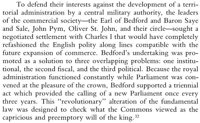 To the extent the English Civil War was about a bourgeois uprising against the aristocracy (it mostly wasn’t), it was the Quaker-weavers disputing Parliament’s authority. And they lost. Total Parliament victory. In the long run, Parliamentarians got everything they wanted.