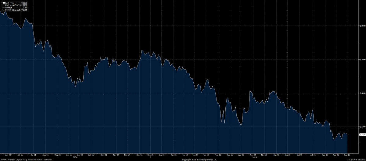 The chart below shows real rates falling since April which means less and LESS of a real return for being on the sidelines.