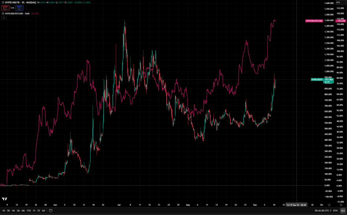 HYPEUSD is already outperforming BTCUSD and we are now seeing $HYPD outperform $MSTR as traders move out the risk curve to oppurtunities that have more upside because they are earlier in the adoption cycle of things.