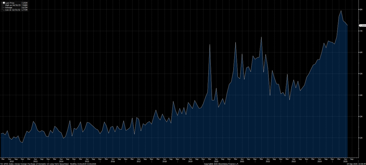 The purchase of US securities by foreigners has become a massive factor in US markets as a result of this: (Chart below shows gross purchase of US securities)