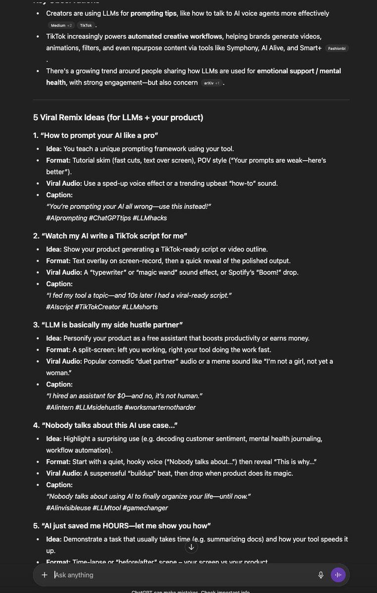 “Scan TikTok trends in [niche] and suggest 5 remixes using my product/message.