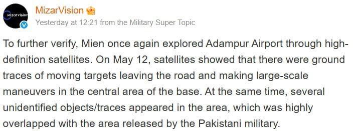 True-color satellite imagery from Adampur AFS, India, reveals multiple impact sites at the location of an S-400 battery, which was subsequently struck by Pakistan Air Force CM-400AKG missiles. 5/