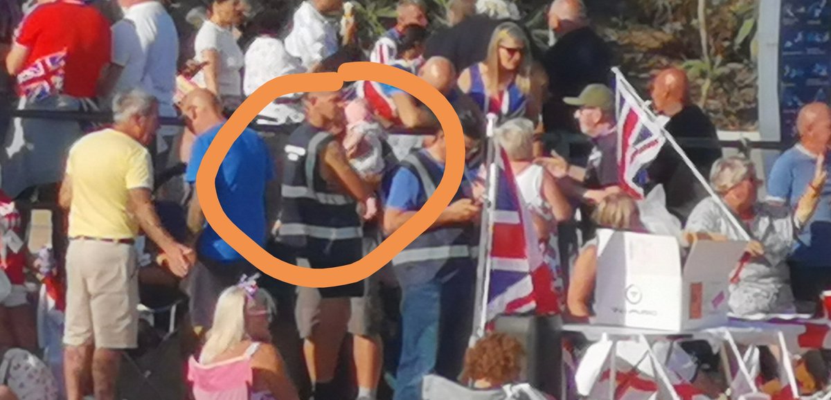 Though the "Safeguard Patrols" aren't officially starting until the 11 August I noticed several people wearing their vests at this aftermath of an anti illegal immigrants protest at a migrant hotel last week. So it's clear they have those views