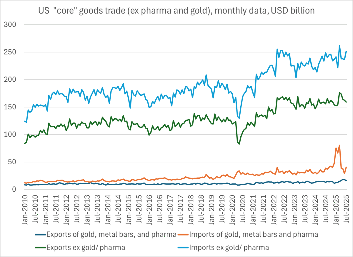 Set aside the craziness in pharmaceuticals and gold -- which drove enormous volatility in the reported trade balance in both q1 and q2 -- and the monthly trade data looks surprisingly normal