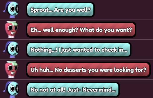...Sprout! A key part of his character is how he's always looking out for others, yet his dialogue with Astro implies the opposite. He's noticeably blunt and accusatory towards him, and though Sprout has a habit of being short with toons, he's normally not THIS undiplomatic.
