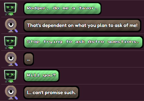 But Astro sees through it. He knows Vee, and he knows she isn't being herself here. She's emulating Sprout. Her intentions are genuine, but the way she's going about it isn't. Especially with how this heavily contrasts the way she speaks to Astro in their second interaction.