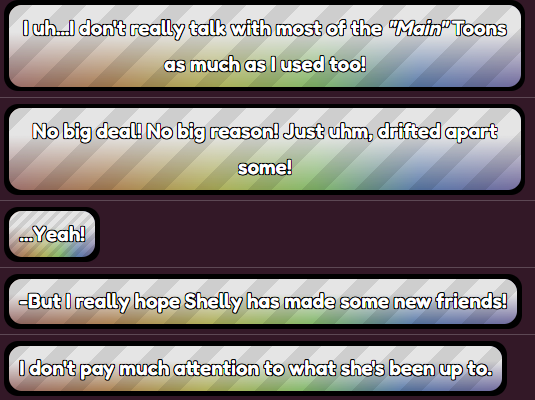 Recently, I've seen many posts discussing Shelly and her characterization of being forgotten/ignored. Specifically, they seemed critical of this trait and thought Shelly would realistically not fit that role. "Kids love dinosaurs!" or "Shelly is too kind!" are repeated rebuttals.