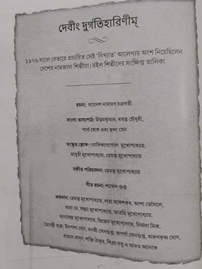 radio broadcast of Mahisashurmardini by Birendrakrishna Bhadra, Pankaj Mullick, Bani Kumar with a fresh slate. Allegedly it was primarily Sanjay Gandhi's idea to relaunch it with the motive of projecting a stronger Durga imagery paralleling it with the regime.