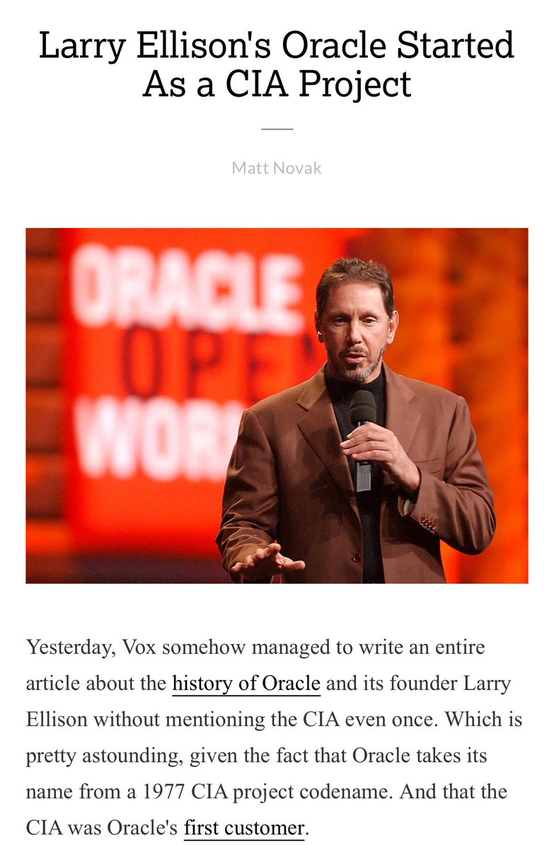 Isn’t it amazing how Oracle takes its name from a 1977 CIA project codename and that the CIA was Oracle's first customer?