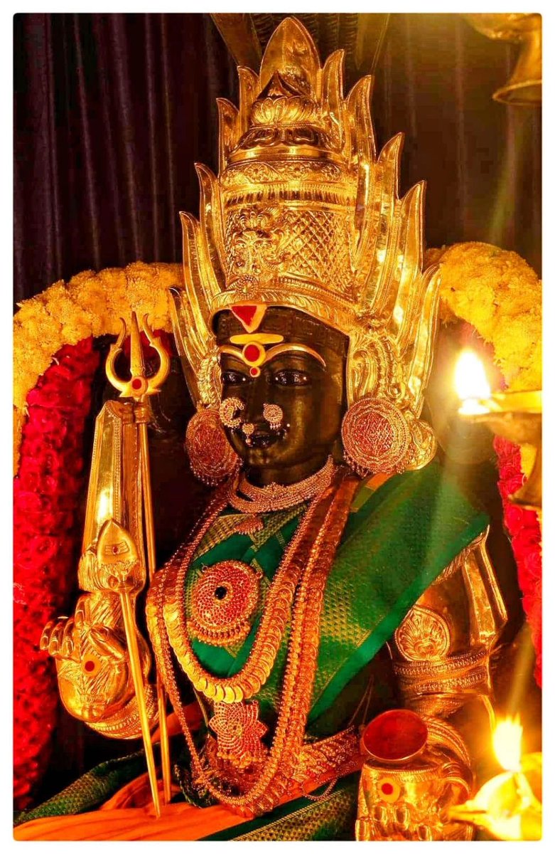 2️⃣ Clad in green silk, shining with gold, holding the Trishul of Dharma, Maa Bhavani is not just a deity…