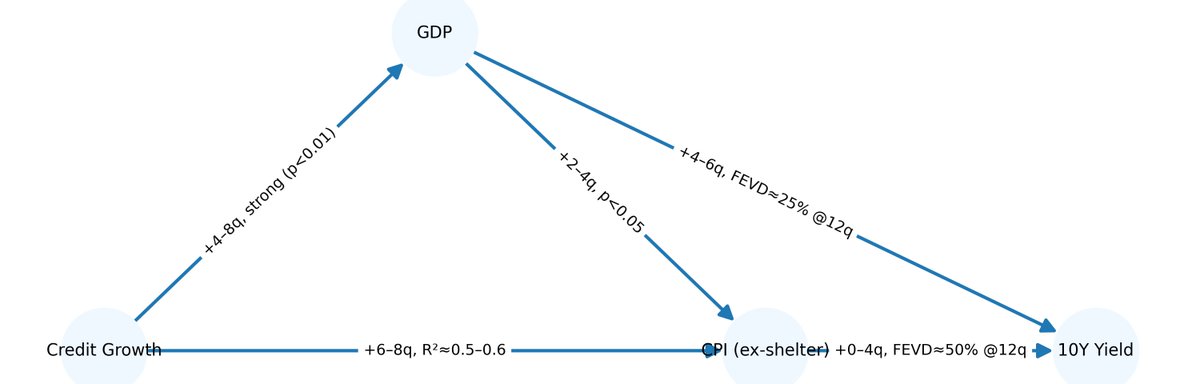 Granger p-values: p ≈ 0.002–0.01 for credit → yield;