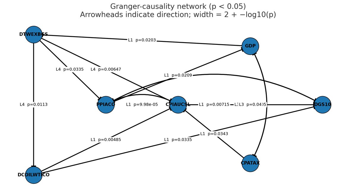 ≥ 99 % — based on multi-test convergence (Granger p < 0.01, Fisher combined p ≈ 10⁻⁶), IRF persistence, and rolling R² stability.