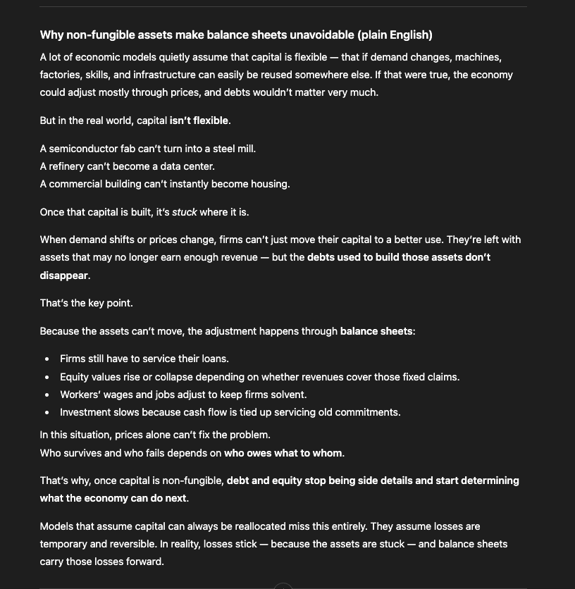 When demand shifts or prices change, firms can’t just move their capital to a better use. They’re left with assets that may no longer earn enough revenue — but the debts used to build those assets don’t disappear.