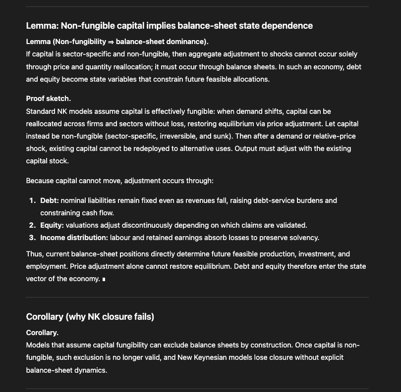 Once capital is non-fungible, such exclusion is no longer valid, and New Keynesian models lose closure without explicit balance-sheet dynamics.