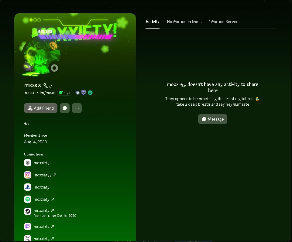 This is "Moxx," the pre-established friend Celeste greeted in the server, noting she had thought he had deleted discord with no prior server interactions, which further indicates previous chat groups.