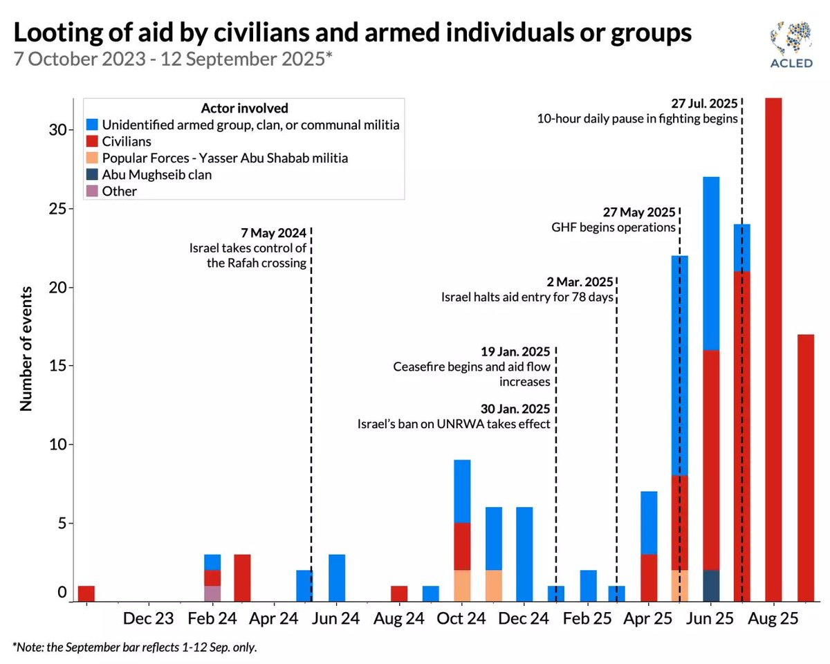 2. ACLED data show aid looting surged after Israel’s May 2024 takeover of the Rafah crossing and skyrocketed when the U.S.-backed Gaza Humanitarian Foundation began operating in late May 2025. Looting largely stopped during the January ceasefire when Hamas police secured convoys — resuming only once Israeli control and GHF distribution created chaos. Armed gangs, including the Israeli-backed Yasser Abu Shabab militia, drove much of the theft.