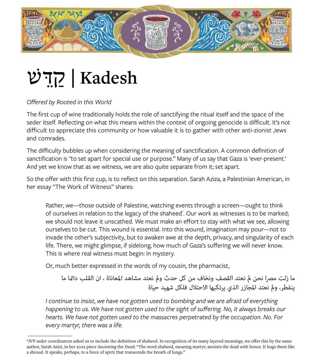 3) Kadesh gives a sense of where we’re going. Every element of a traditional Seder is changed to focus on Gaza, to the exclusion of anything else. Few Jews are quoted, many Palestinians are. You might think, reading this, that the Seder is a Palestinian concept, not a Jewish one.