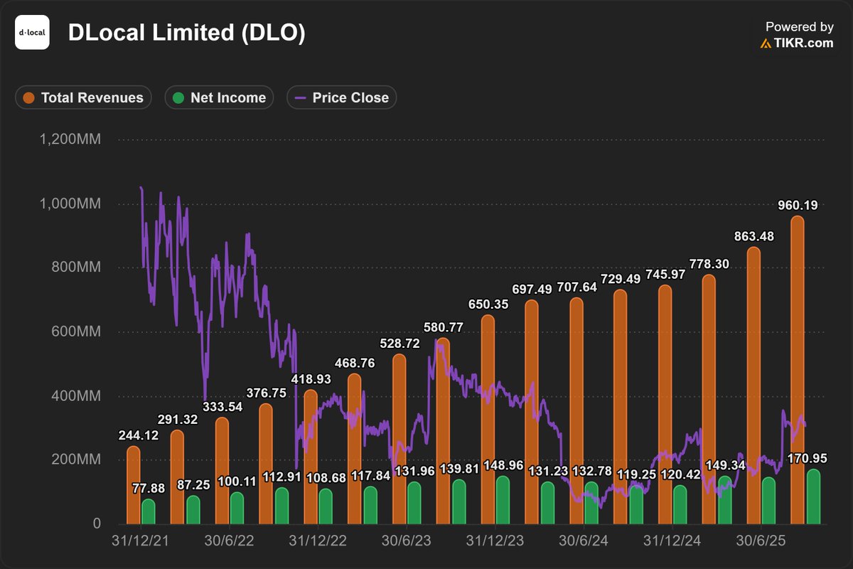 Customers include six of the Magnificent Seven, along with Uber, Tencent, Spotify, Booking, Nike, and Didi, underscoring dLocal’s enterprise-grade positioning. Despite this operational strength, the stock remains flat, reflecting a pronounced valuation disconnect.