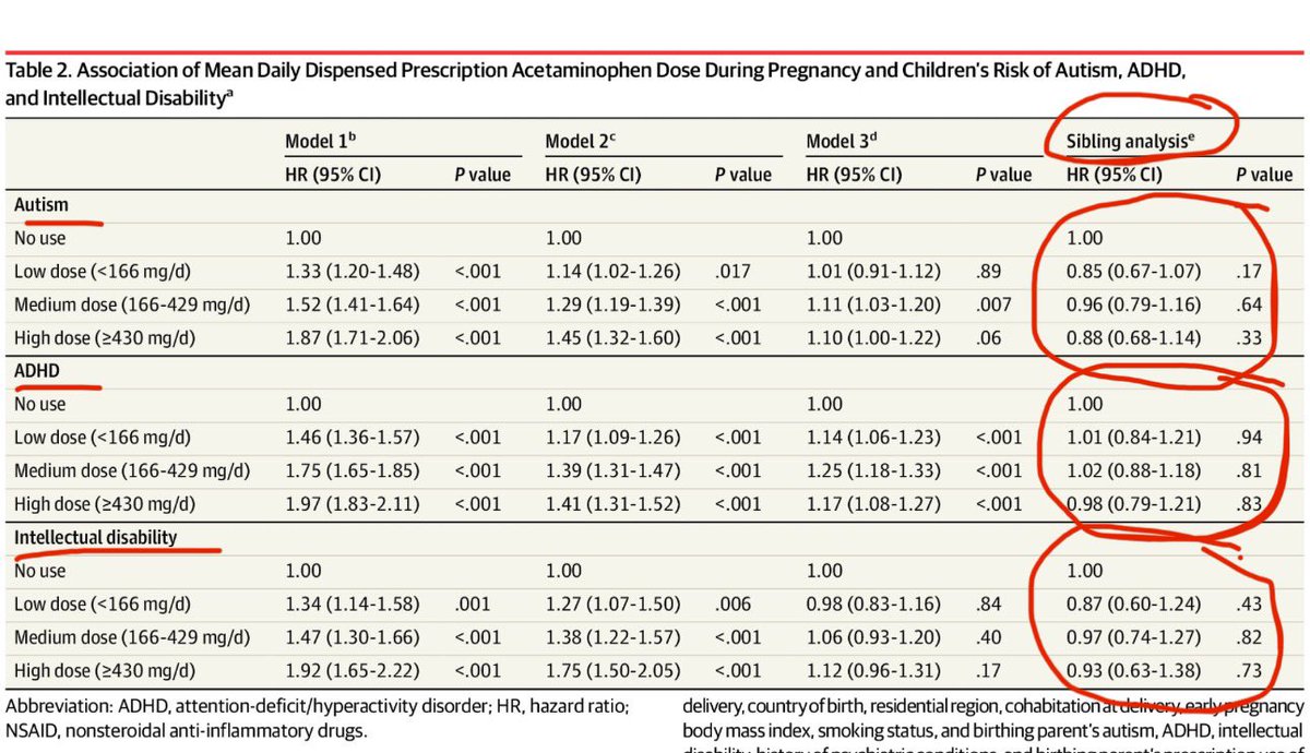 ⚠️TYLENOL & AUTISM—RFK Jr and Trump are wrong—the largest & best study in the world in 2.5 MILLION KIDS—found no increased autism risk with acetaminophen (aka paracetamol, Tylenol) use by the mother during pregnancy. A crude unadjusted analysis found only a preliminary 5% risk, but once you adjust for family by matching using sibling controls (who didn’t get autism), the even tiny 5% risk vaporizes to 0% 📉. (Fun fact: I used to do drug safety epidemiology and have been whistleblower against big pharma when their drugs were dangerous—so I know a few things about drug safety data). Thread 🧵.