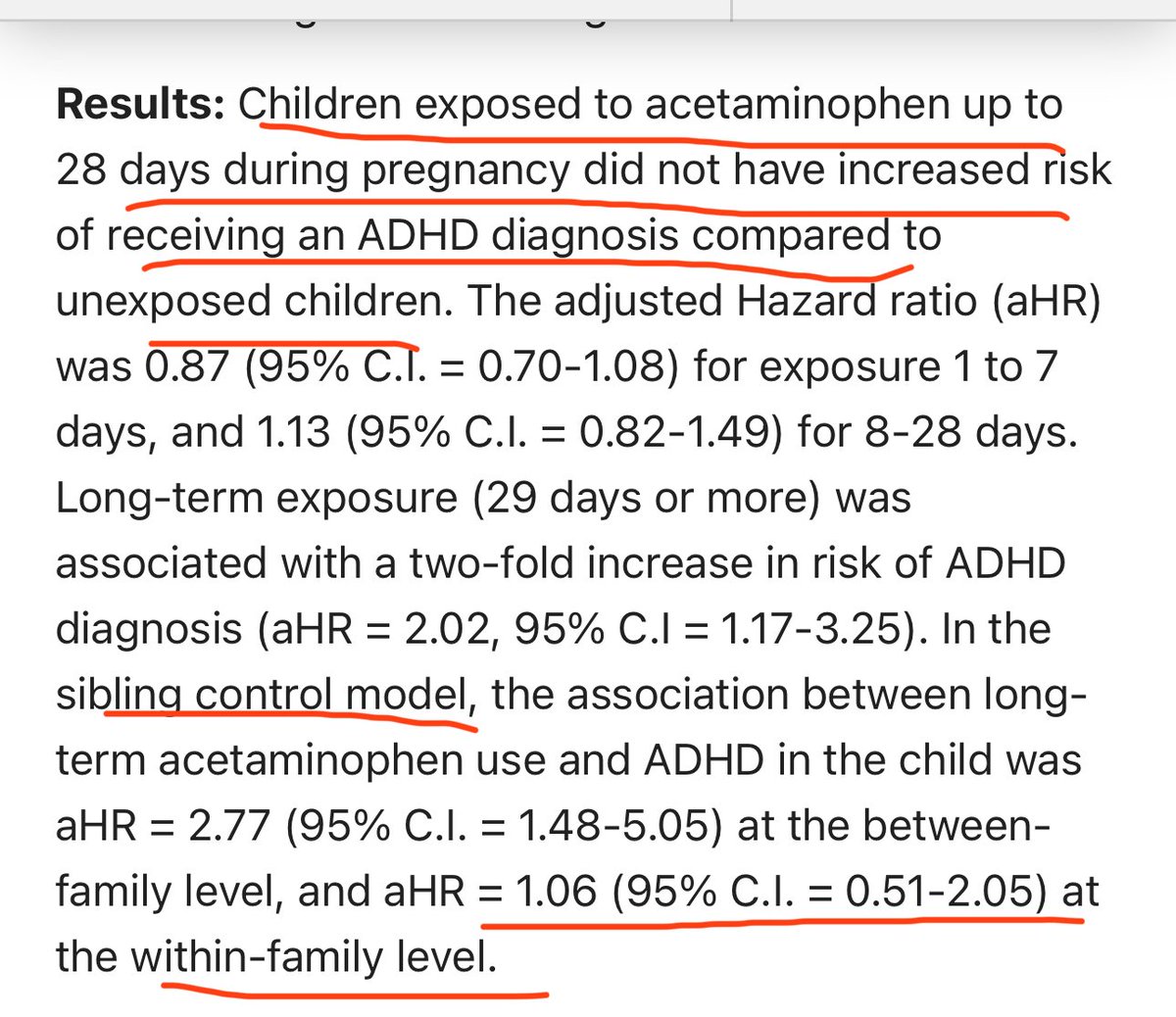 3) “Conclusions and Relevance Acetaminophen use during pregnancy was not associated with children’s risk of autism, ADHD, or intellectual disability in sibling control analysis. This suggests that associations observed in other models may have been attributable to familial confounding.”