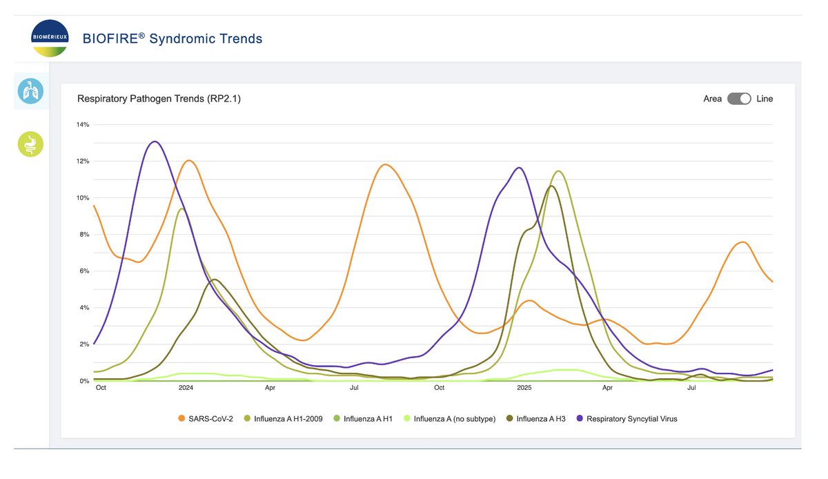 38-5/ BioFire's proprietary syndromic trends tool also shows the current COVID wave is past its peak. And their COVID curves resemble the CDC's NWSS curves. I'm not sure how they derive their data, though. Notice there's a *slight* uptick in RSV and flu.