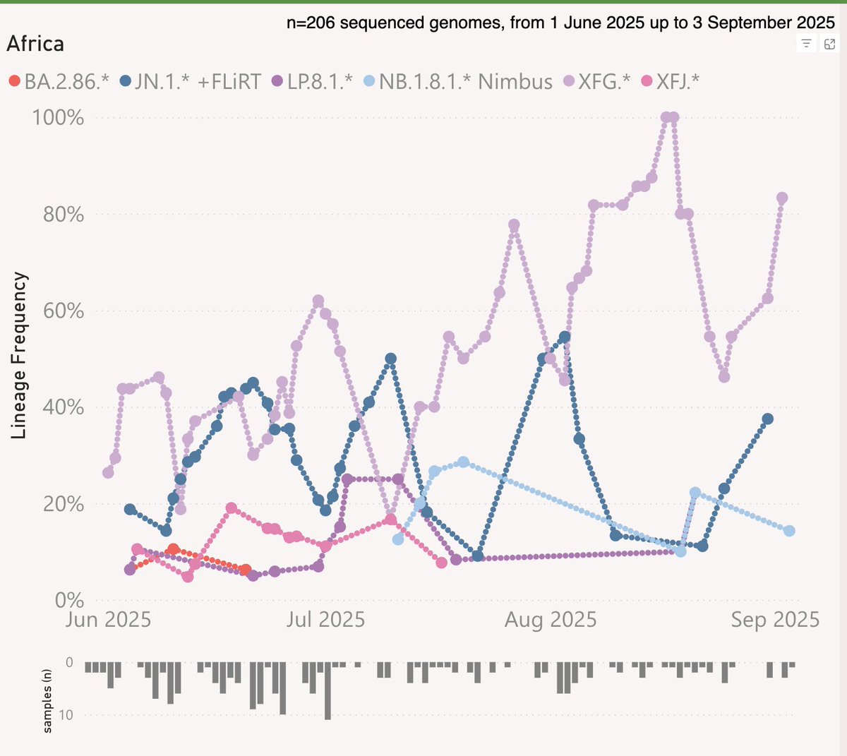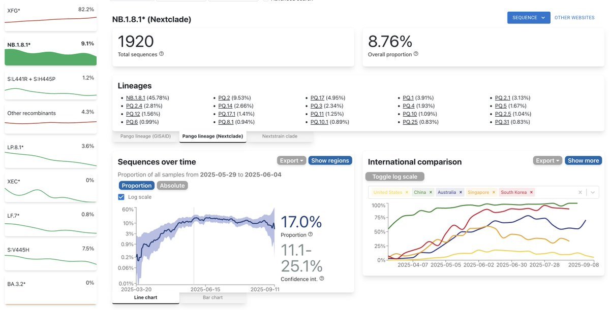 12-3/ If there is a long tail, it's due to the LP.8.1x brood that continues to gain traction against XEC.x. I expected the LP.8.1x's to top out at about 30%, but CoV-Spectrum shows they've reached 50%. O/c, there were only 3 LP.8.1x descendants a month ago. Now there are 19.