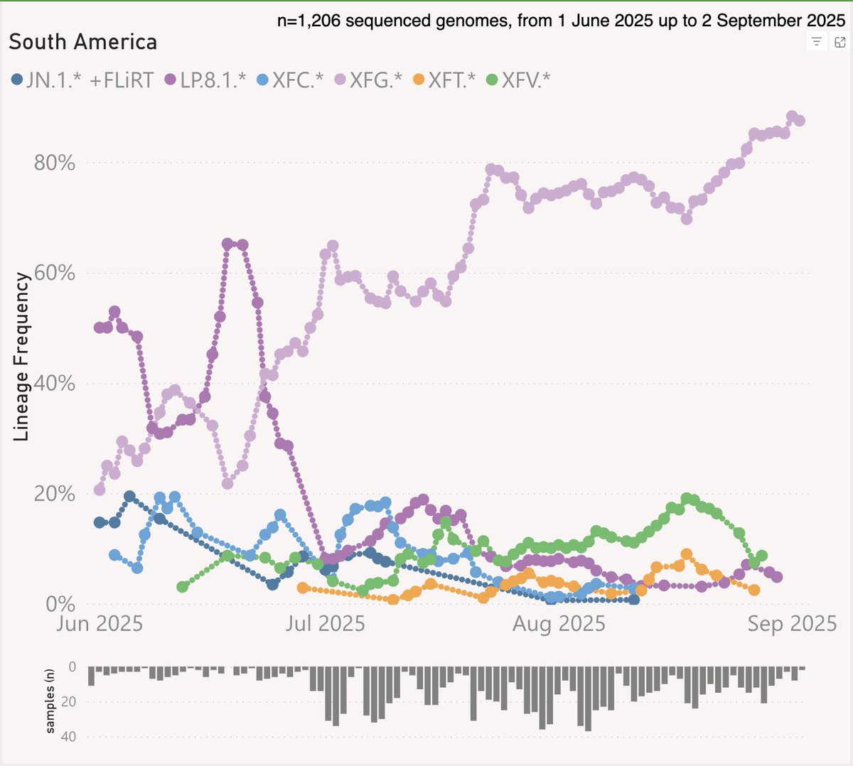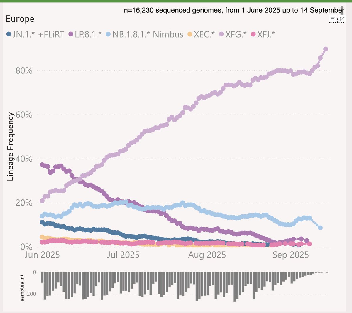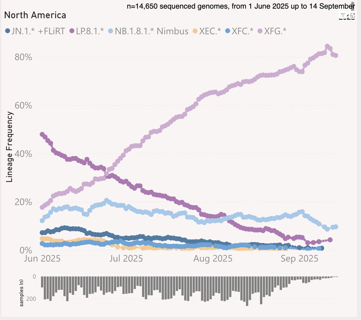 38-6/ XFG (aka "Stratus") and its descendants were the primary driver of our summer wave. Early on, it looked like it would be an NB.1.8.1 ("Nimbus") wave, but XFG left it in the dust.