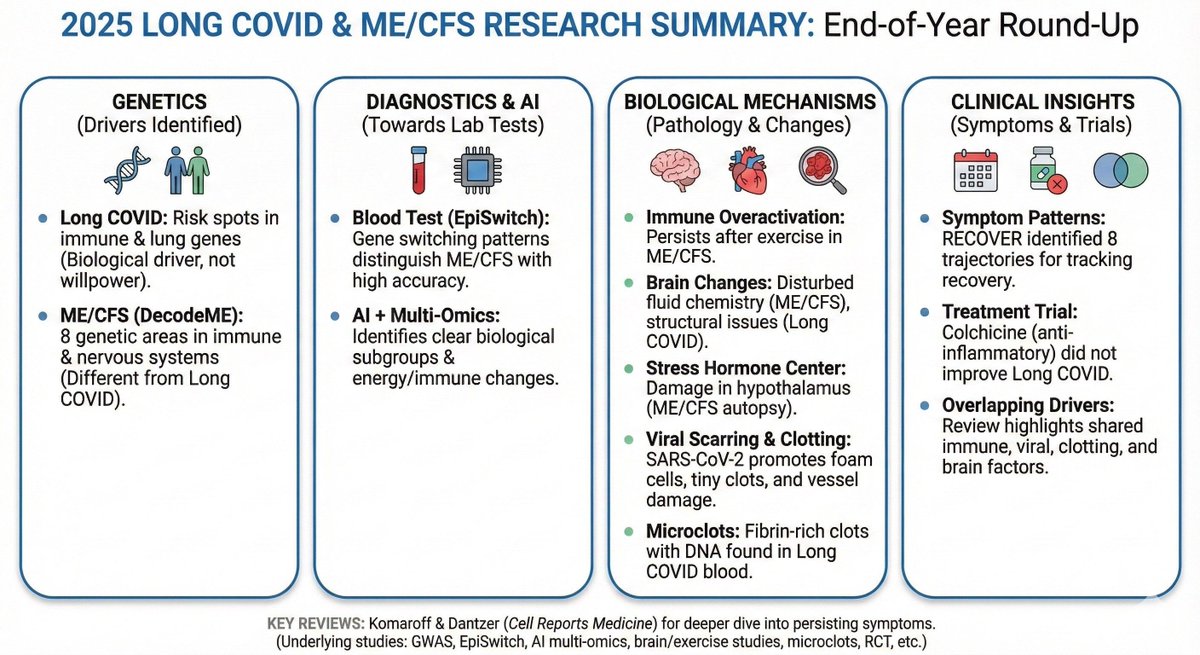 Genes tied to risk, immune and clotting changes, PEM findings, possible blood tests, and brain changes.