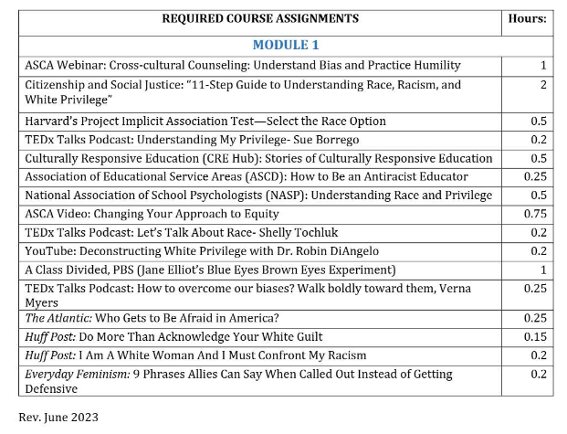 DEI Specialist Training to ensure each school counselor drive the "America/white people is oppressive" rhetoric into K-12, all disguise as "mental health". Let's take a look at a sample of their modules...
