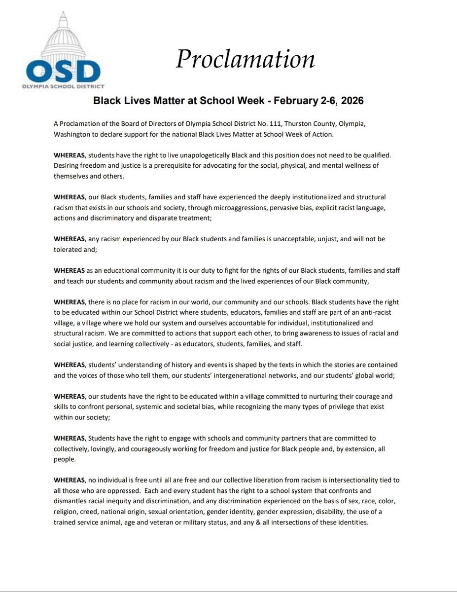 BREAKING: Olympia School District in Washington state just issued a proclamation supporting Black Lives Matter at School Week of Action.