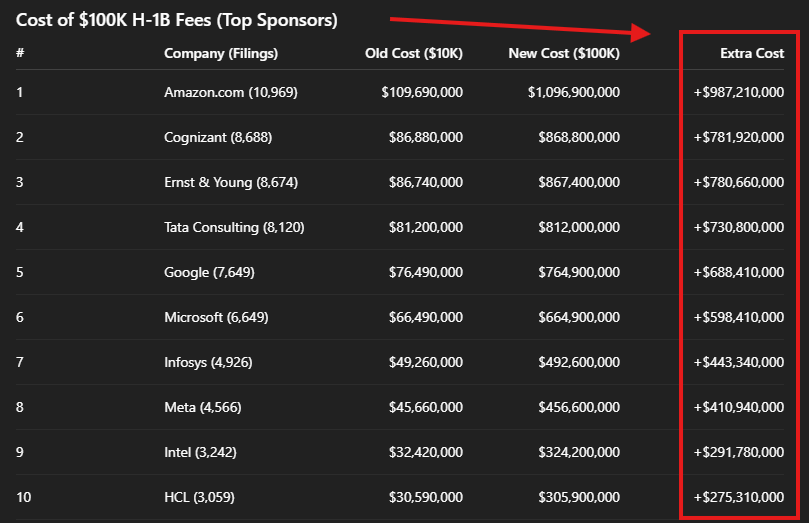 The US issues ~85,000 new H-1B Visas per year, which will now cost $8.5 BILLION/year.