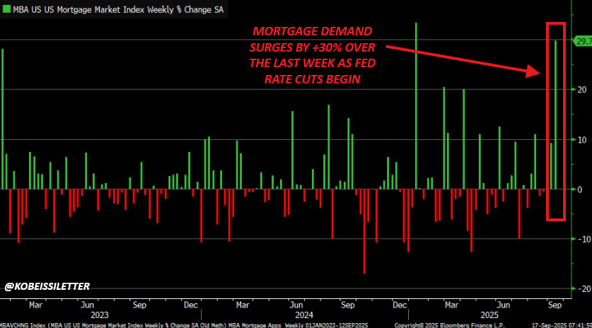 US mortgage demand just surged +29.7% over last week as Fed rate cuts began.