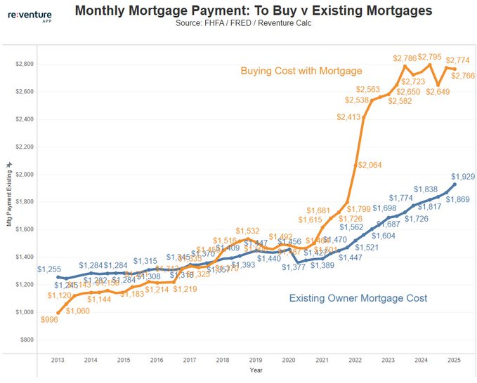 According to Reventure, it costs ~$800/mo more to buy a house with a mortgage than to keep your house with a mortgage.