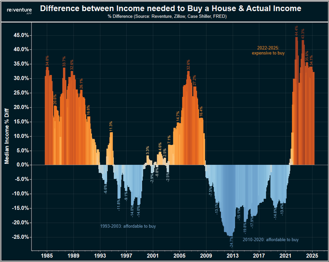 Lastly, take a look at this graph of income needed to buy a home versus household income, per Reventure.
