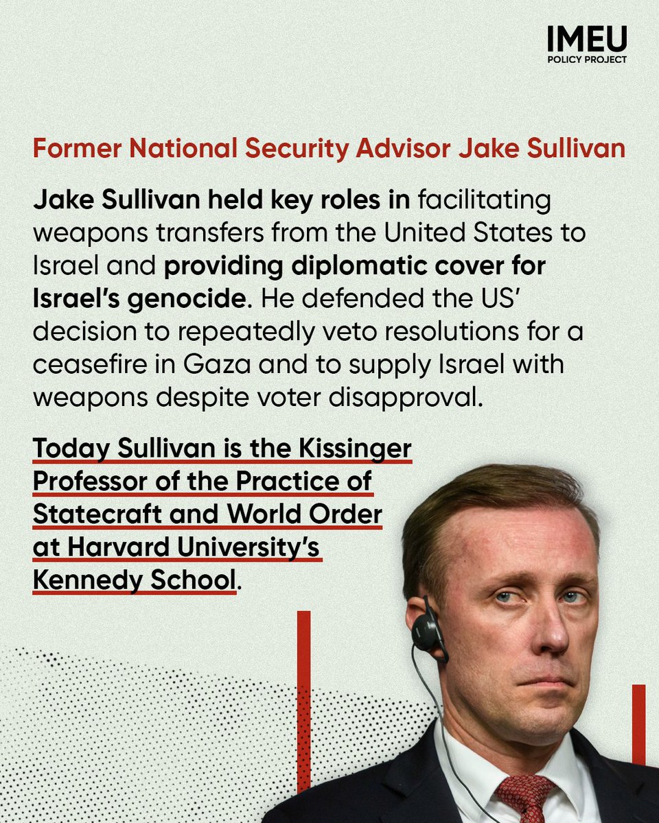 Former National Security Advisor Jake Sullivan facilitated weapons transfers from the US to Israel and provided diplomatic cover for Israel’s genocide.