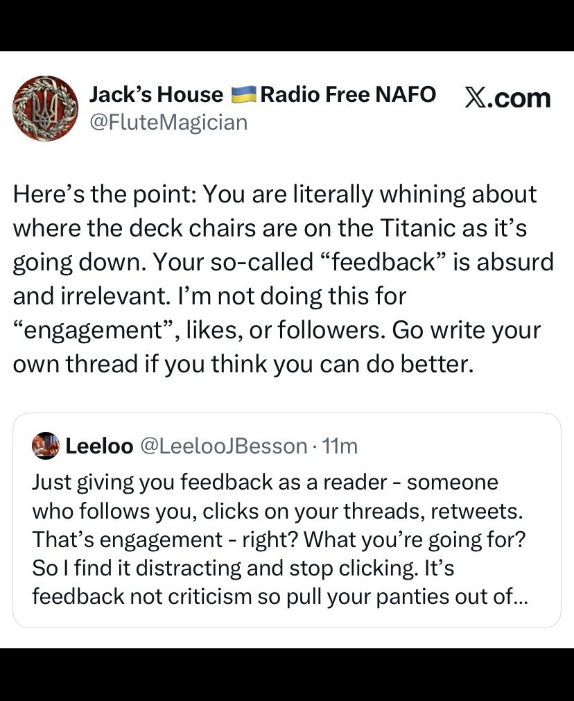 20) I will not be risking my ass for an opposition that wants to bicker amongst itself, argue, whine about NAFO or whoever isn’t ideologically pure enough for them, and simply cannot get its shit together when the shit has obviously hit the fan. It isn’t worth it.