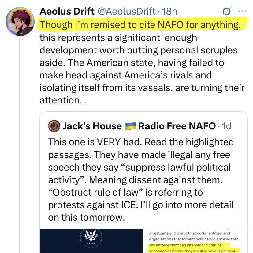 13) Or how about this guy who acts like it’s some kind of moral victory for himself to add a qualifier statement criticizing NAFO. The Left continues to sabotage themselves when Code Pink and Marjorie Taylor Greene say the same things about Ukraine that, by the way, Putin does.⬇️