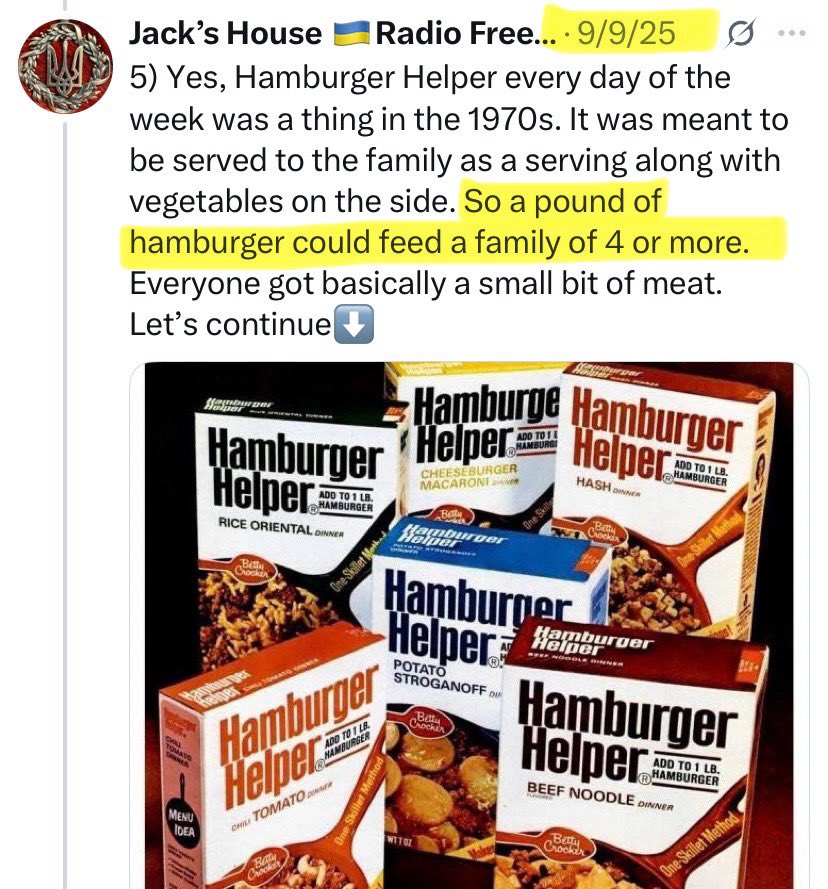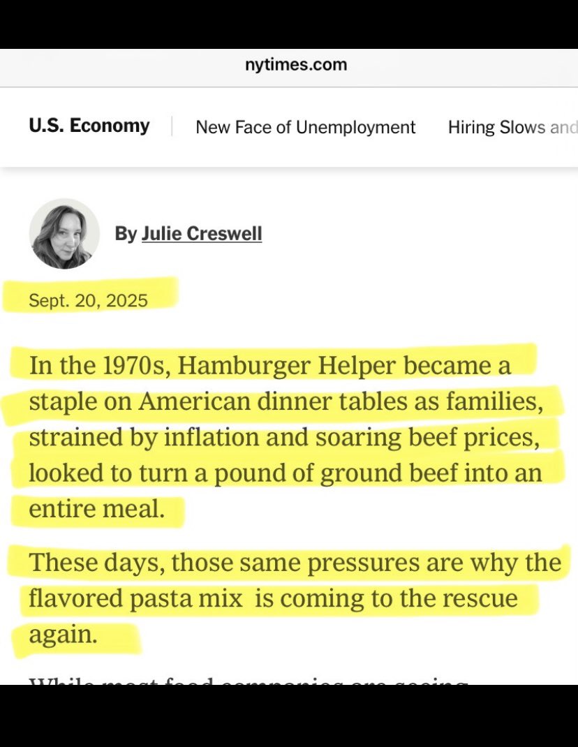 1) You see? It is as I told you on 9/9/25. Now appears a NYT article 9/20/25 showing you the key indicator of soaring food prices: Hamburger Helper. It was invented in 1971 because of inflation. I’ll show you the thread these screenshots are from. But first⬇️
