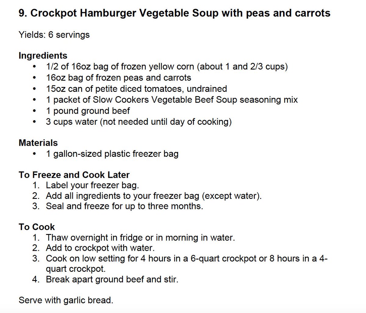 9. Crockpot Hamburger Vegetable Soup with Peas and Carrots with Garlic Bread