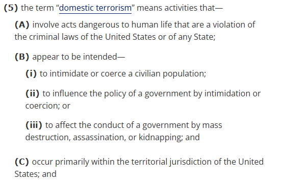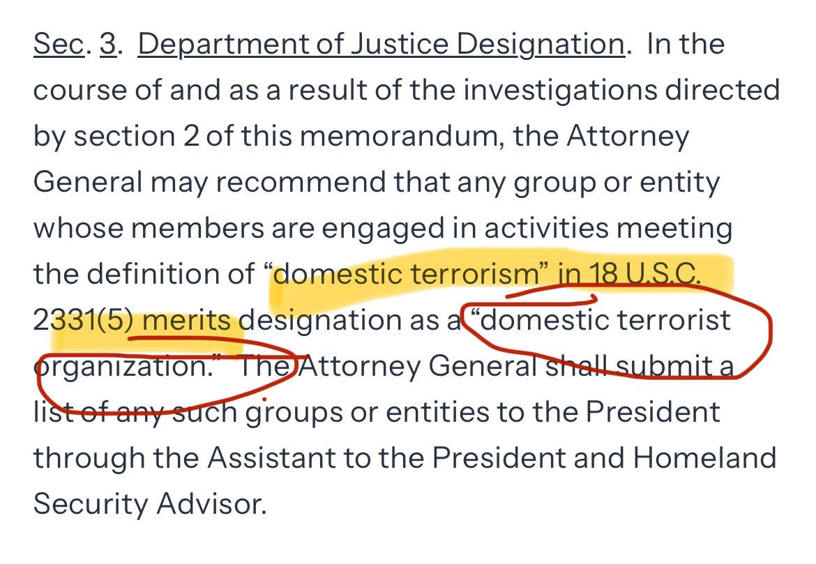 The memoranda says that the DoJ should "designate" you as part of a "domestic terrorist organization" under 18 U.S.C. 2331(5).
