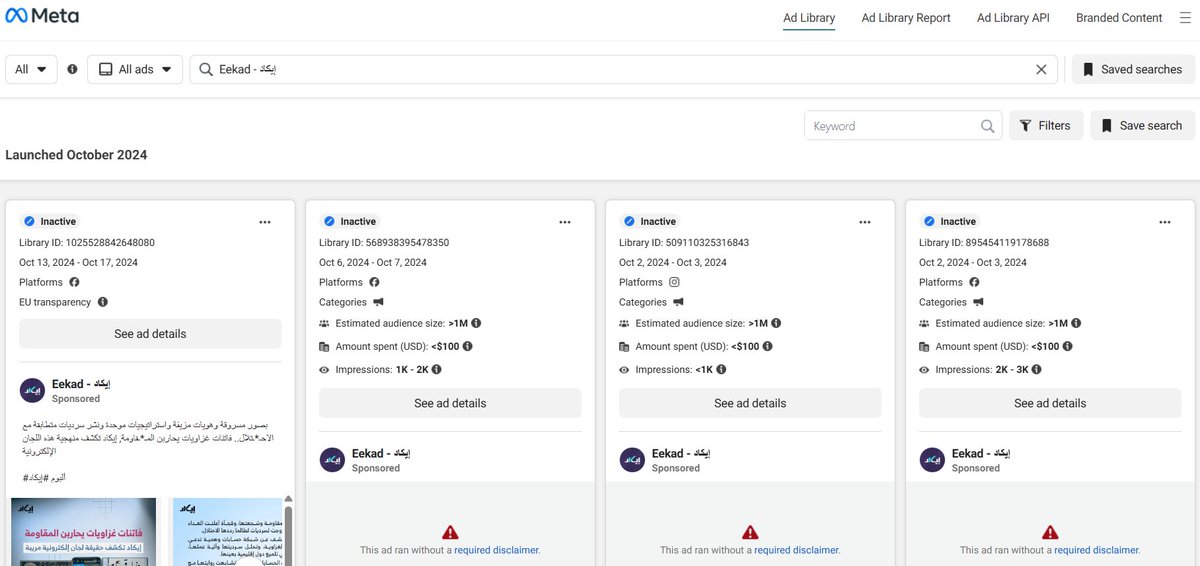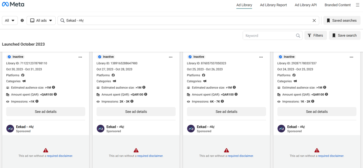 On Facebook’s Ad Center, you can see Eekad has been running ads pretty steadily since October 2023. Most are paid for in Qatari riyals, but some in USD — meaning at least one of their operators in the U.S. is footing the bill.