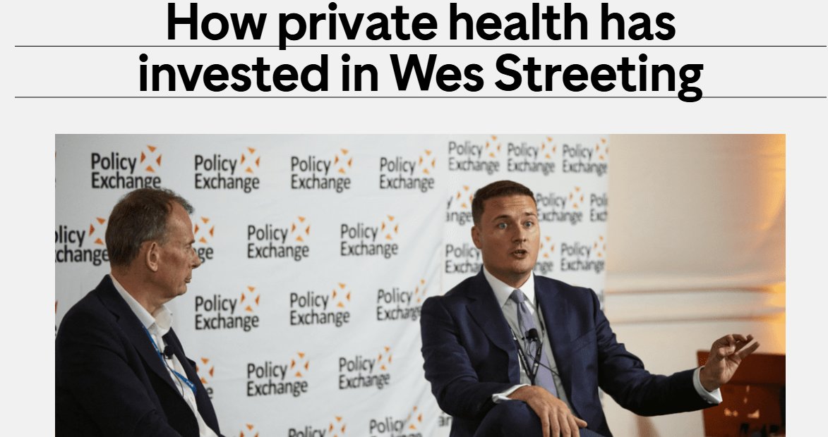Streeting received thousands from pro-Israeli lobbyists Jonathan Mendelsohn + Trevor Chinn and £65k from private healthcare-linked John Armitage.