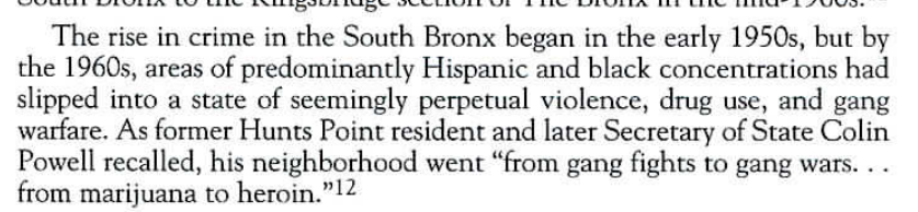 This changed in the 60s/70s, when black and Hispanic residents entered the Bronx en masse, attracted by public housing and rent-controlled apartments. For some reason, crime and drug use exploded around the same time. Knives, mugging, shootings, drugs, gang warfare.