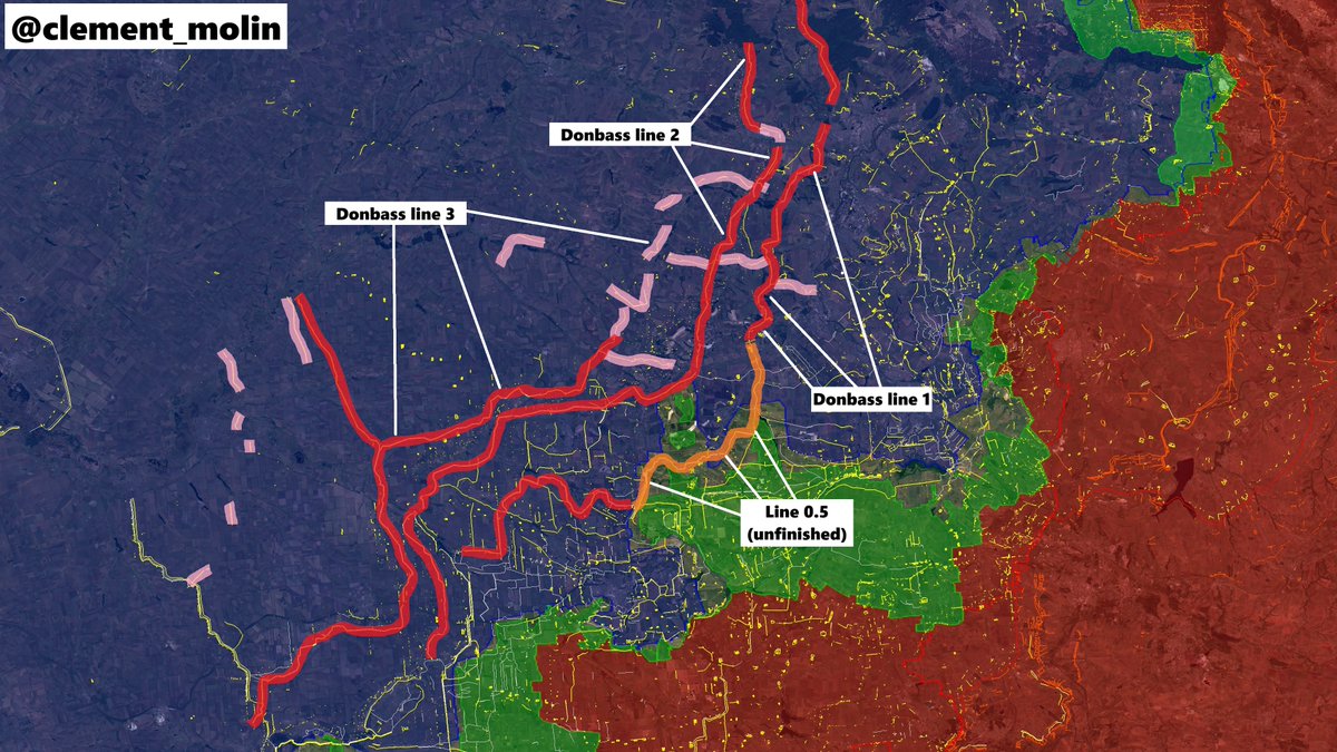 To explain, the Donbass line 2 was built before the other ones. It was later reinforced in some parts by the 1st one (or sometimes 0.5 because it is unfinished) and behind, a third line has been prepared, now being connected with the second.